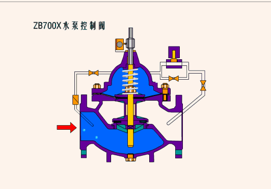 七、700X水泵控制閥當水泵工作閥門向下游供水時,電磁導閥全開,針閥調到適當開度,上游水經過針閥,導閥,單向閥進入主閥控制室,經電磁導閥流出,此時主閥控制室壓力保持主閥處于合適開度,保持下游正常供水。700X水泵控制閥當水泵停止工作時,電磁導閥先關閉,主閥停止排水,主閥室壓力升高,主閥開始關閉,當關閉90%時,主閥上部行程開關輸出停泵信號,水泵停止運轉,此時,主閥下游水經過單向閥進入主控制室,控制室壓力升高,主閥關閉。