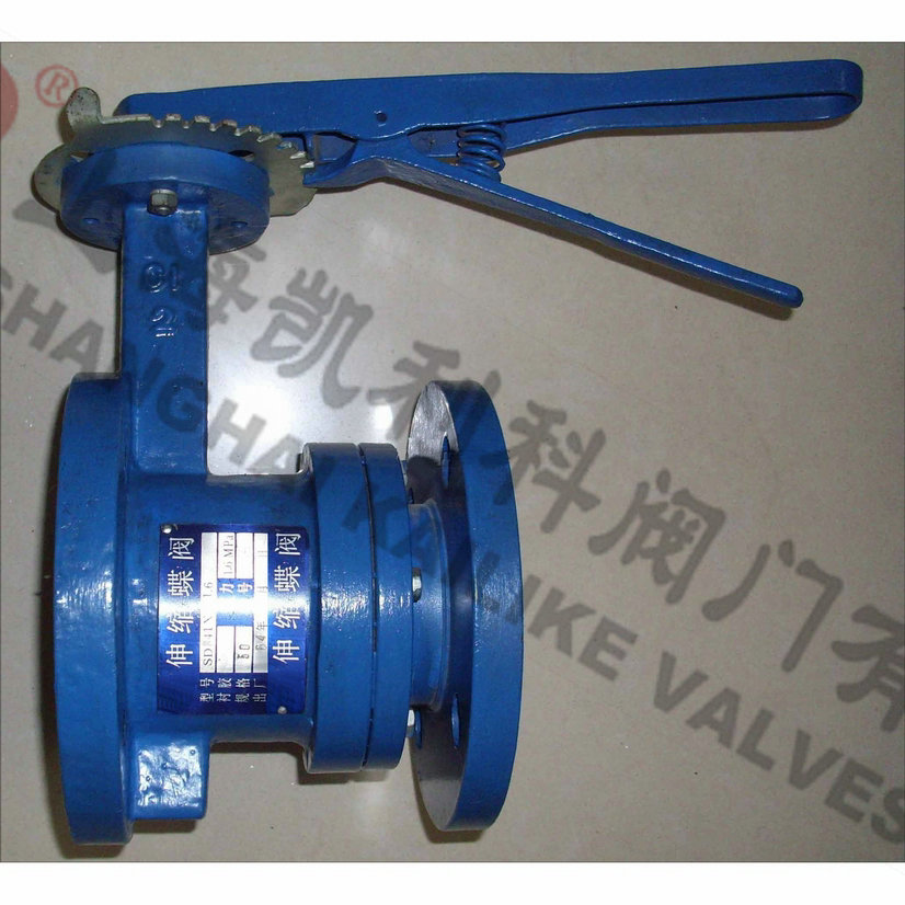 SD41X/SD43H手動法蘭式伸縮蝶閥具有自動補償管道熱脹冷縮方便裝卸的功能,使用于溫度在425℃以下,公稱壓力在1.6MPa以下的石油、化工、電力、造紙、給排水和市政建設等工業管道上作調節流量和載斷流體的最佳裝置。