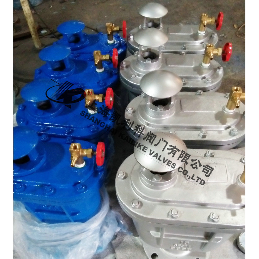 當(dāng)管內(nèi)開始注水時(shí),塞頭停留在開啟位置,進(jìn)行大量排氣,當(dāng)空氣排完時(shí),閥內(nèi)積水浮球被浮起,傳動(dòng)塞頭至關(guān)閉位置,停止大量排氣;當(dāng)管內(nèi)水正常輸送時(shí),如有少量空氣聚集在閥內(nèi)到相當(dāng)程度,閥內(nèi)水位下降,浮球隨之下降,此時(shí)空氣則由小孔排出。當(dāng)抽水機(jī)停止,管內(nèi)水流空時(shí),或遇管內(nèi)產(chǎn)生負(fù)壓時(shí),此時(shí)塞頭開啟,吸入空氣確保管線安全。
