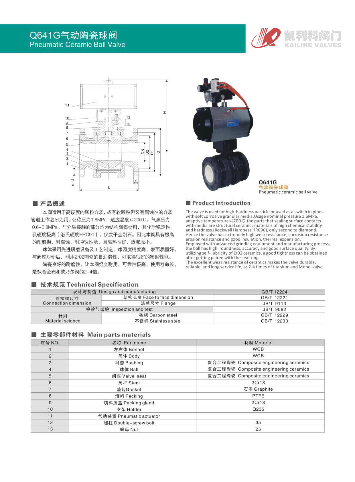 氣動陶瓷球閥本閥適用于高硬度的顆粒介質,或有軟顆粒但又有腐蝕性的介質管道上作啟閉之用。公稱壓力1.6MPa,適應溫度≤200℃。氣源壓力0.6-0.8MPa。與介質接觸的部分均為結構陶瓷材料,其化學穩定性及硬度極高(洛氏硬度HRC90),僅次于金剛石。因此本閥具有極高的耐磨損、耐腐蝕、耐沖蝕性能,且隔熱性好、熱膨脹小。